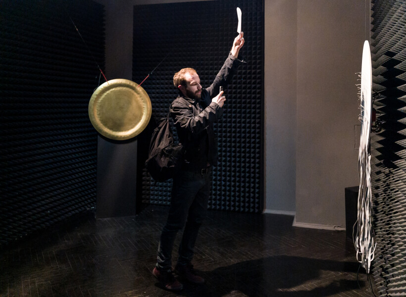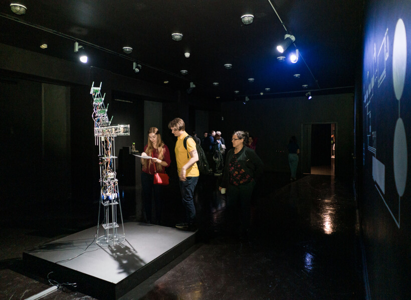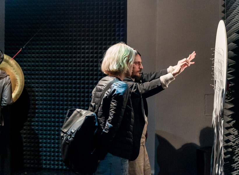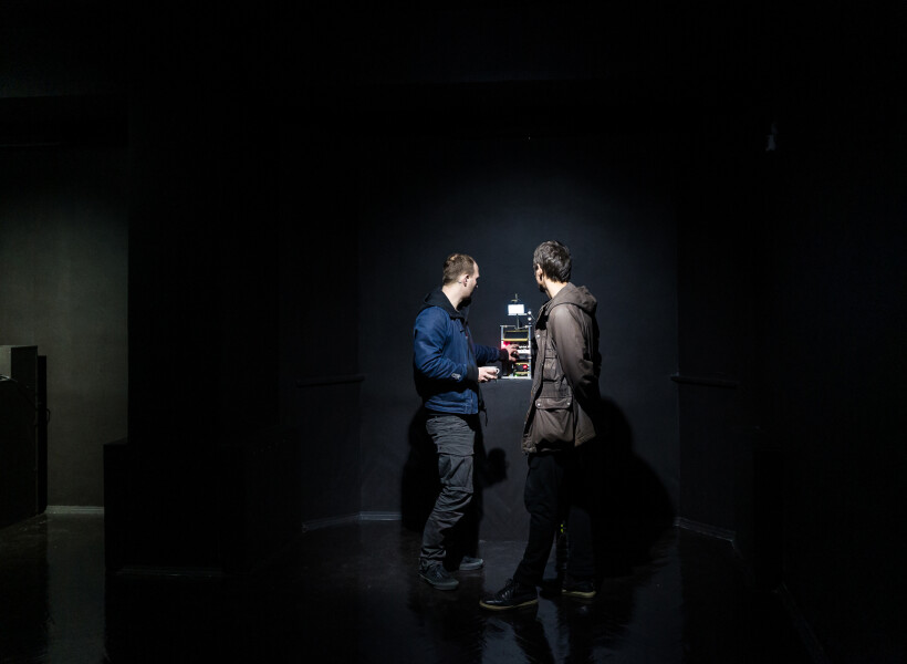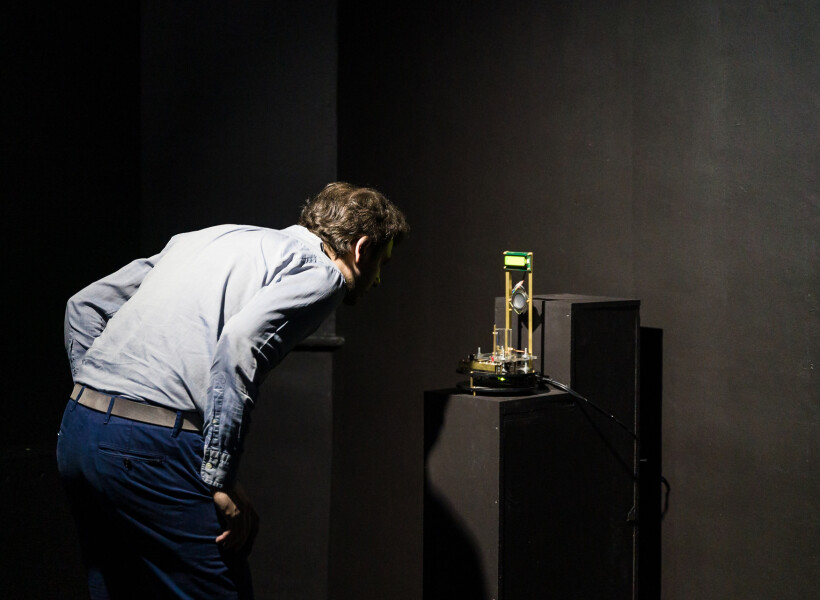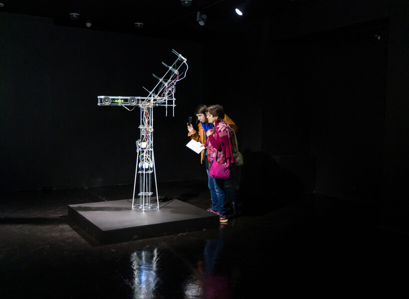At the exhibition, Morozov presents three of his works: the sound installation Mayak, a “voice of the Internet” – an orchestra of WiFi routers composing techno music from the network acitvity; the kinetic object Waveguide, where he two motors specifically twist the wire of the device. With this kind of work, the artist places an emphasis on the link between emergent systems and new kinds of technological synthesis.