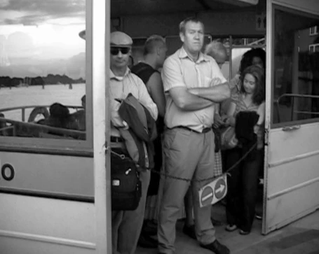 Mariateresa Sartori recorded people embarking on the boats in Venice during the Sunday summer rush hour. Human traffic is regulated by the mariner who opens and closes access to the boat with a chain, blocking the flow when necessary. Manners, gestures and expressions distinguish those who departed from those left behind. The artist has captured a micro-phenomenon that conveys the universal significance of the human condition, where a specific incident becomes symbolic.