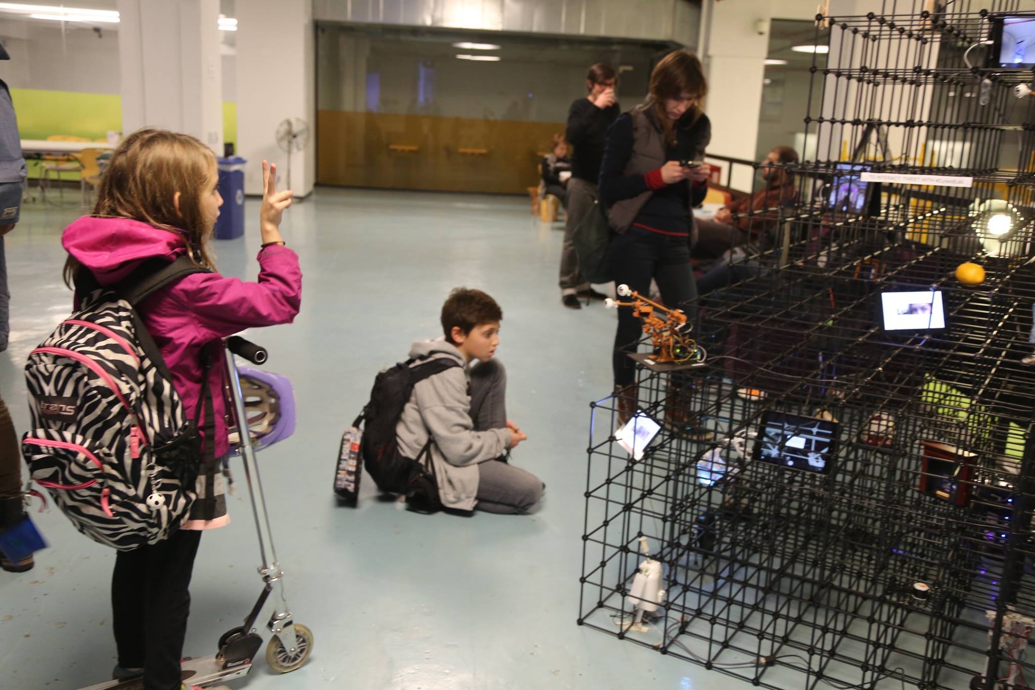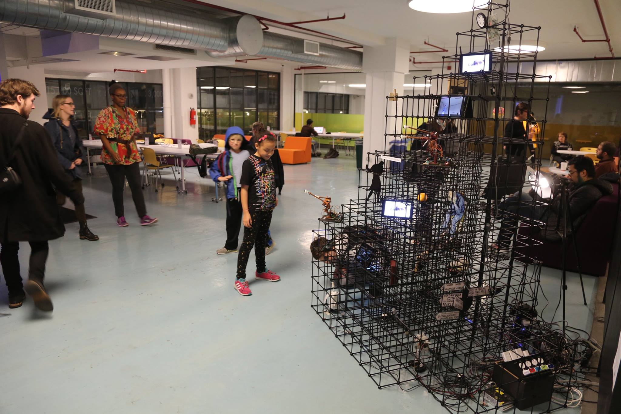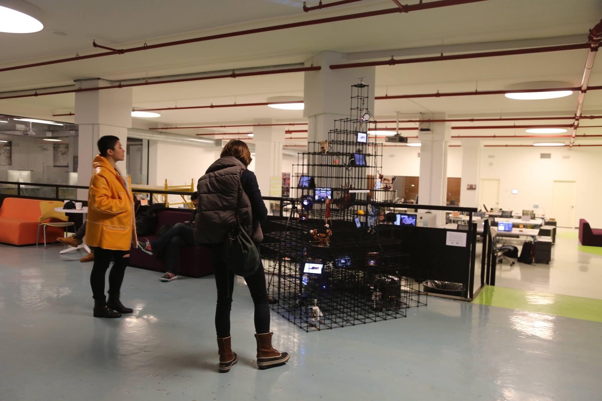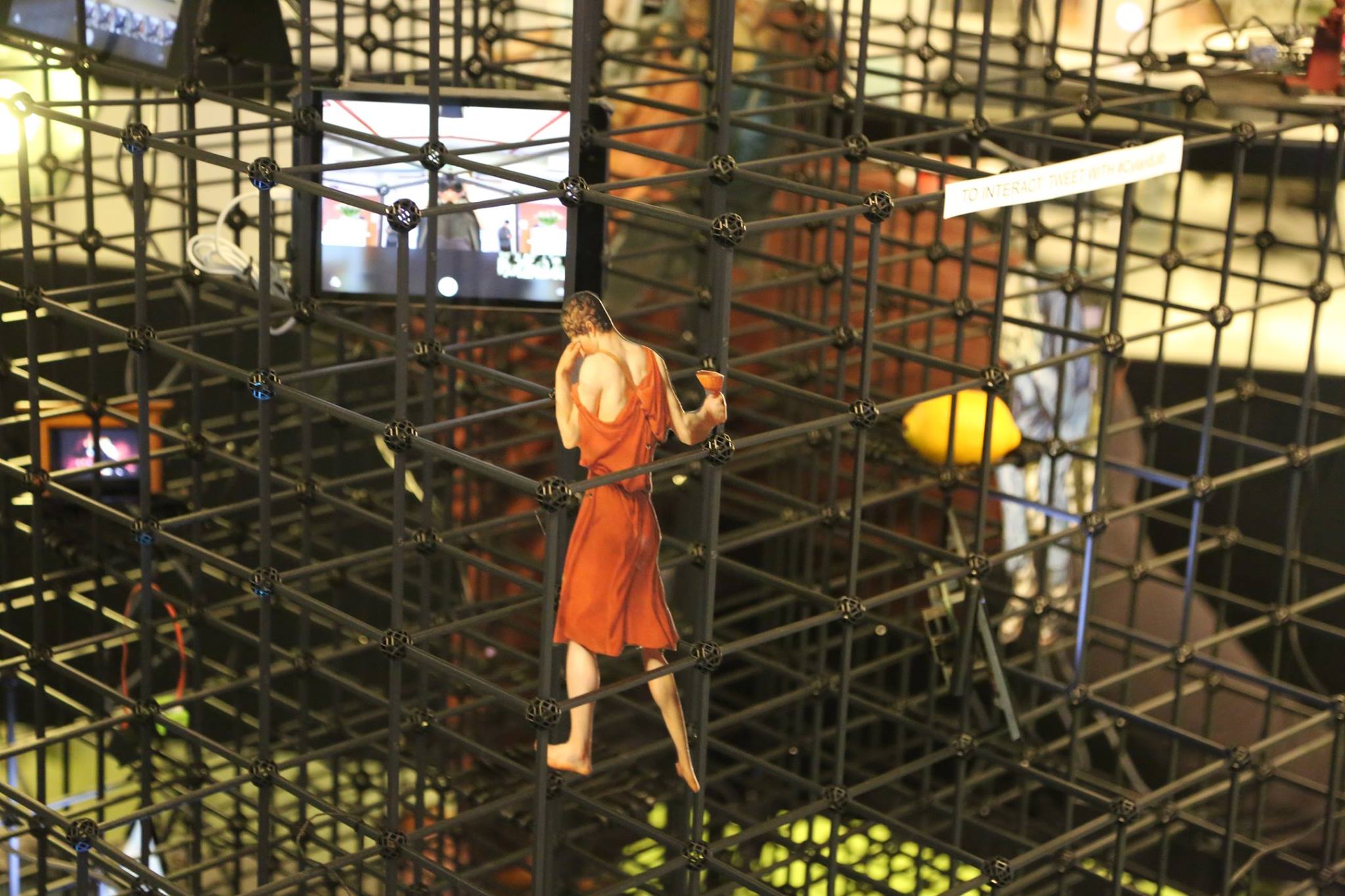 Also on display from 12/1 – 12/9 is No. 0, a modular, 3D public art installation by Anna Frants. Conceptually referencing a computer grid and visually reflecting the infrastructure of a building sans walls – Frants builds an open framework room of hollow, polypropylene cubes. The exposed scaffolding houses objects, videos, and movements. The interior (unlived-in lived-in) space is empty for viewers to navigate the visuals, sounds, words, and virtual actions of the exterior matrix and formulate their own story.