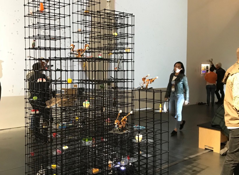 Comprised of raw polypropylene cubes, the exposed framework houses objects, videos, and movements. The interior (unlived-in lived-in) space is empty for viewers to navigate the visuals, sounds, words, and virtual actions of the exterior matrix and formulate their own story. Birds chirp, recorded faces communicate, playful toys whiz and whirl, the seas ebb and flow – each with brand names that they are sold as or known by as characters in Frants’ theatrically staged work and beyond.
