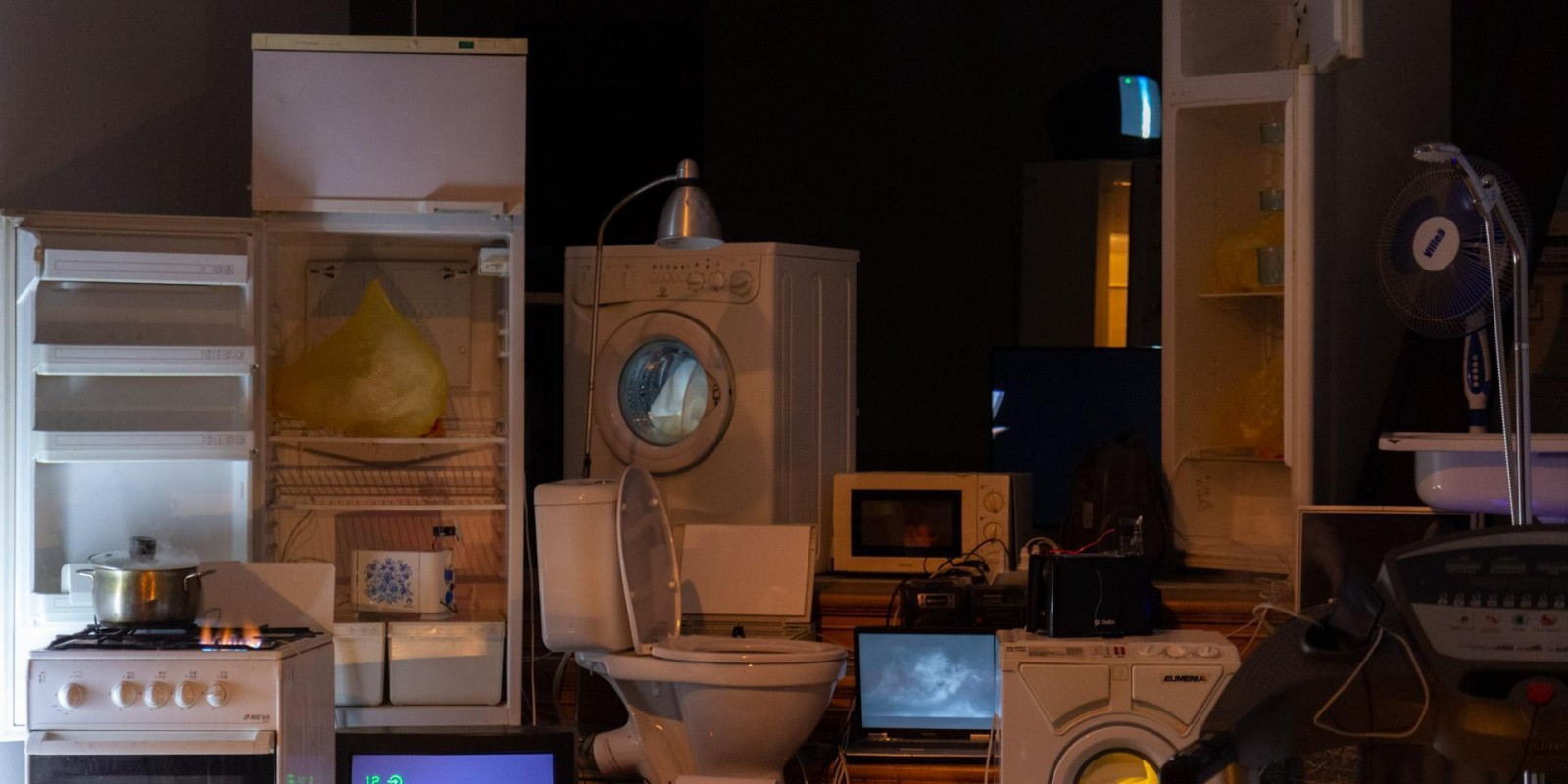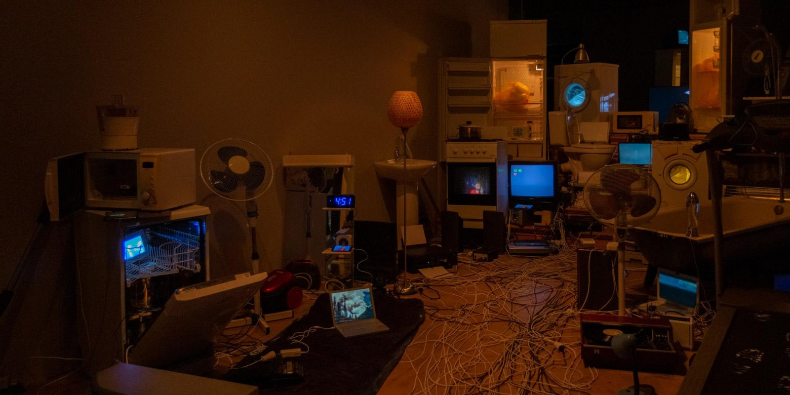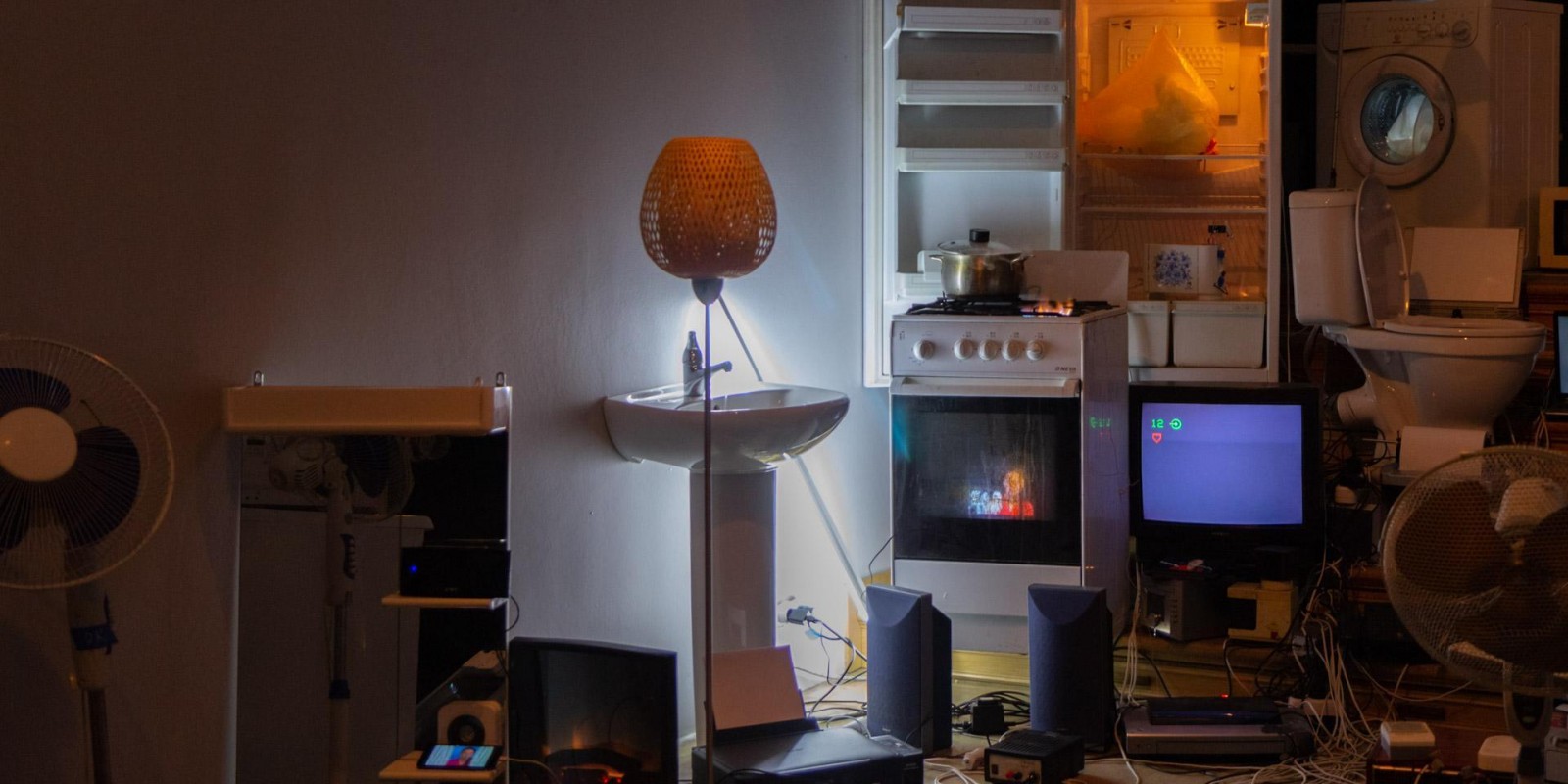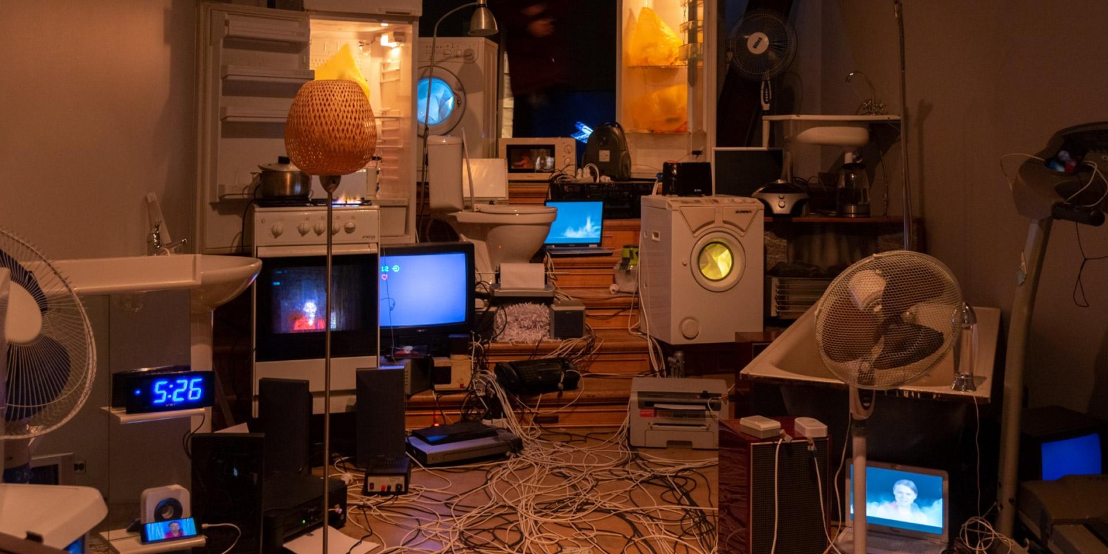 Marina Alekseeva has always been interested in the social structures of contemporary society, which the artist has explored through the prism of the physical and material environment of human habitation. A new joint project with Vladimir Rannev reflects back on a series of Alekseeva’s lightboxes from the 2000s that recreated miniature versions of the interiors of various religious buildings, from a cathedral to a mosque and an Orthodox church. The subject under examination in the total installation “The Whole Shebang” is the main temple of the modern human — their home, filled to the brim with devices and gadgets.