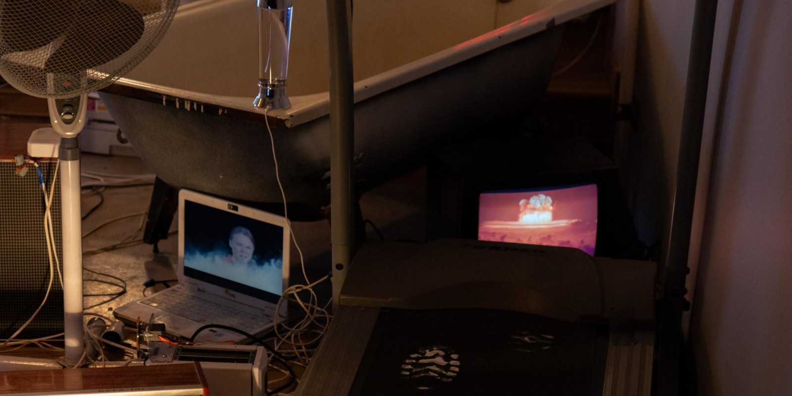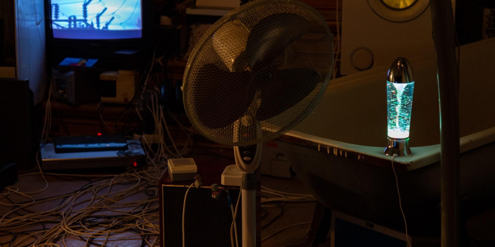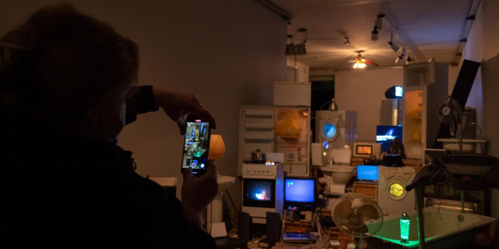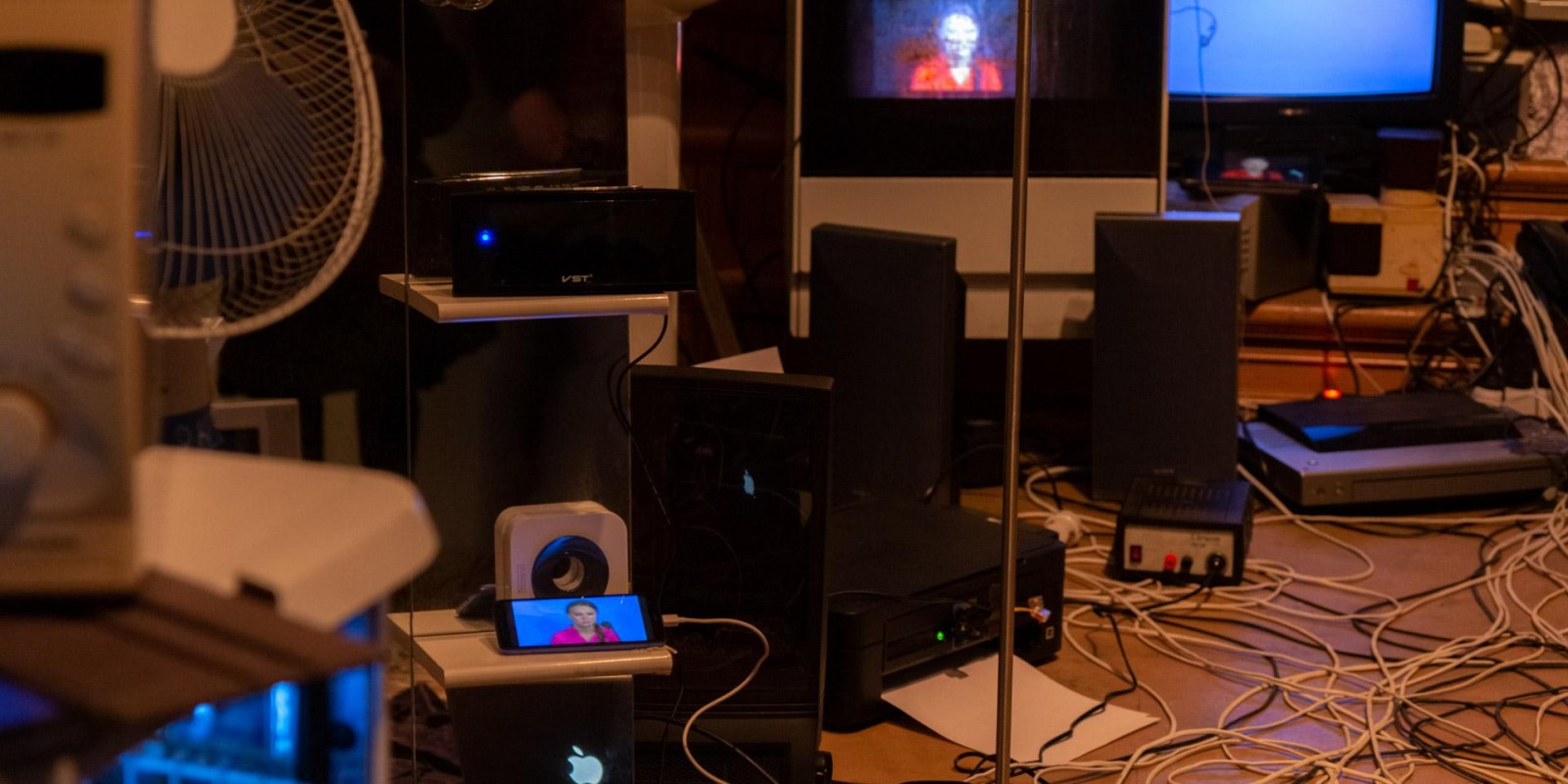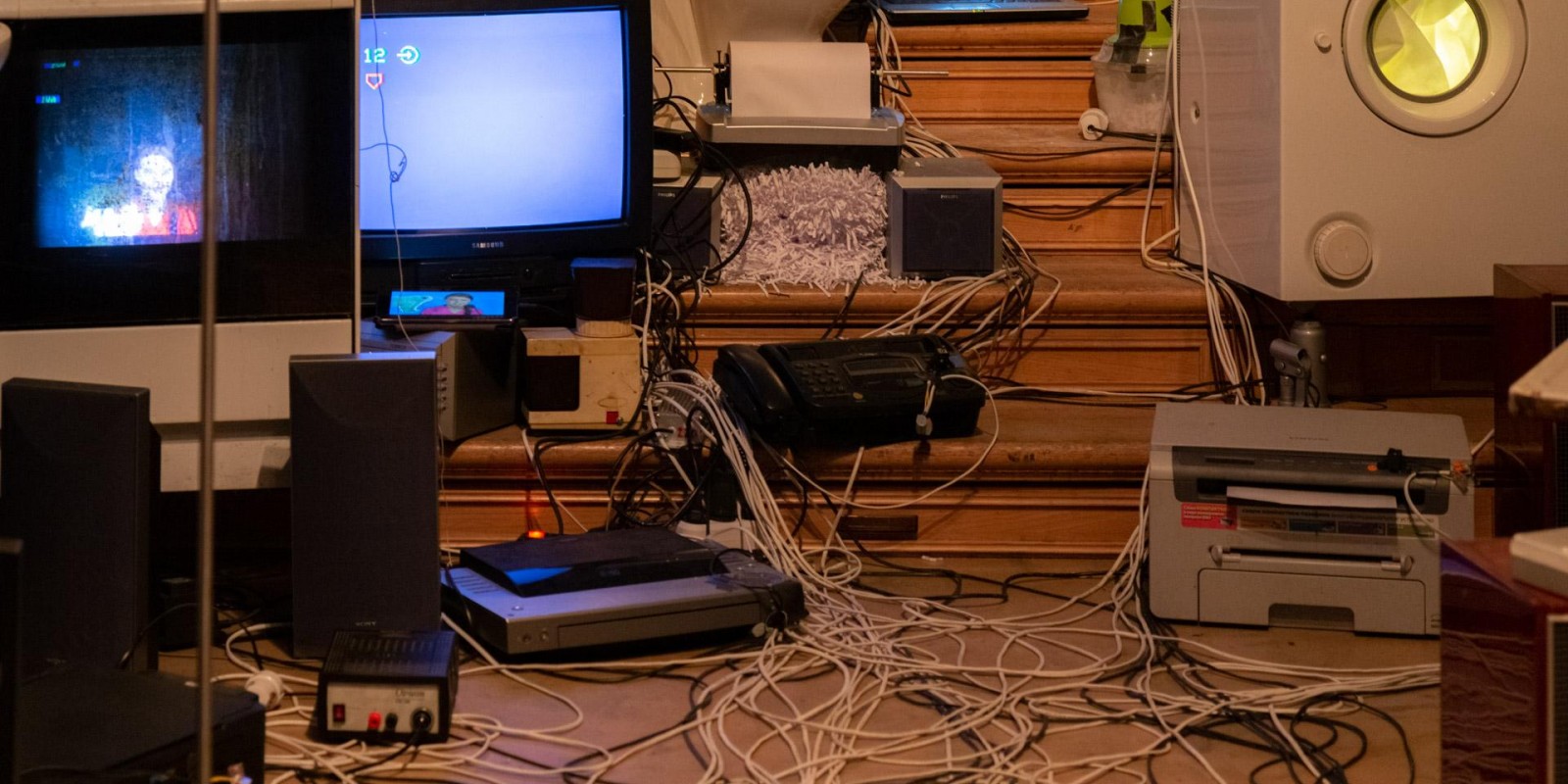 Marina Alekseeva has always been interested in the social structures of contemporary society, which the artist has explored through the prism of the physical and material environment of human habitation. A new joint project with Vladimir Rannev reflects back on a series of Alekseeva’s lightboxes from the 2000s that recreated miniature versions of the interiors of various religious buildings, from a cathedral to a mosque and an Orthodox church. The subject under examination in the total installation “The Whole Shebang” is the main temple of the modern human — their home, filled to the brim with devices and gadgets.