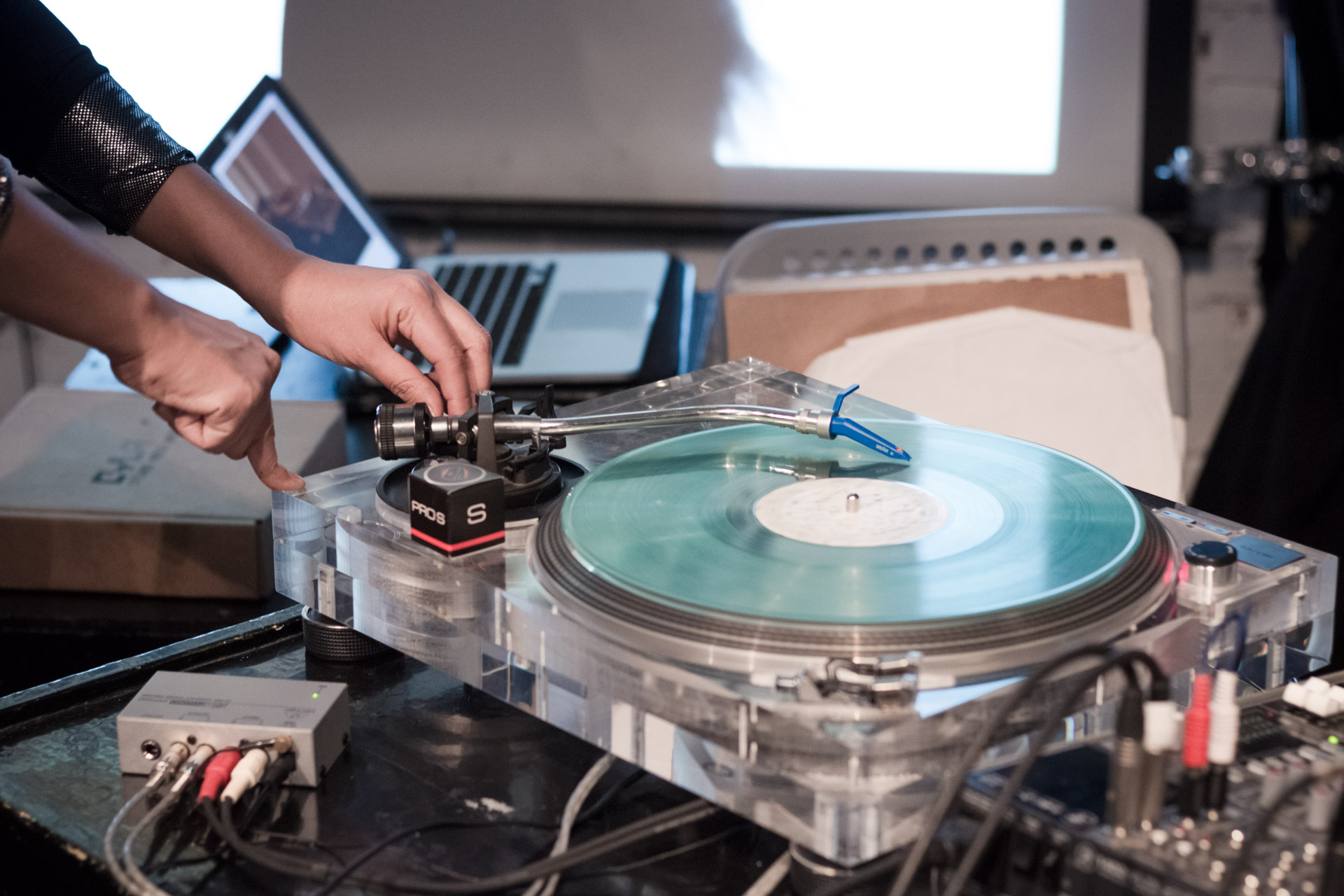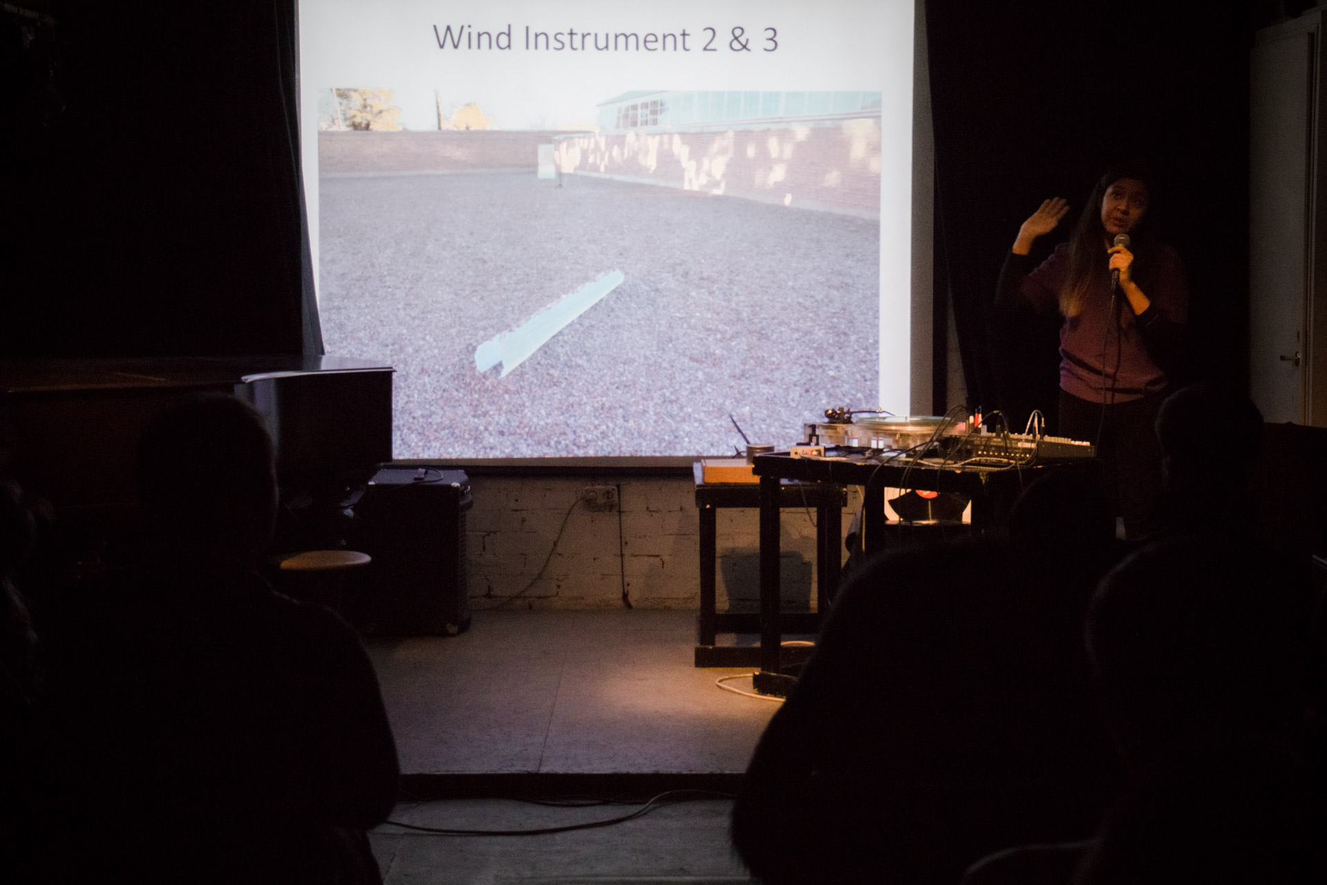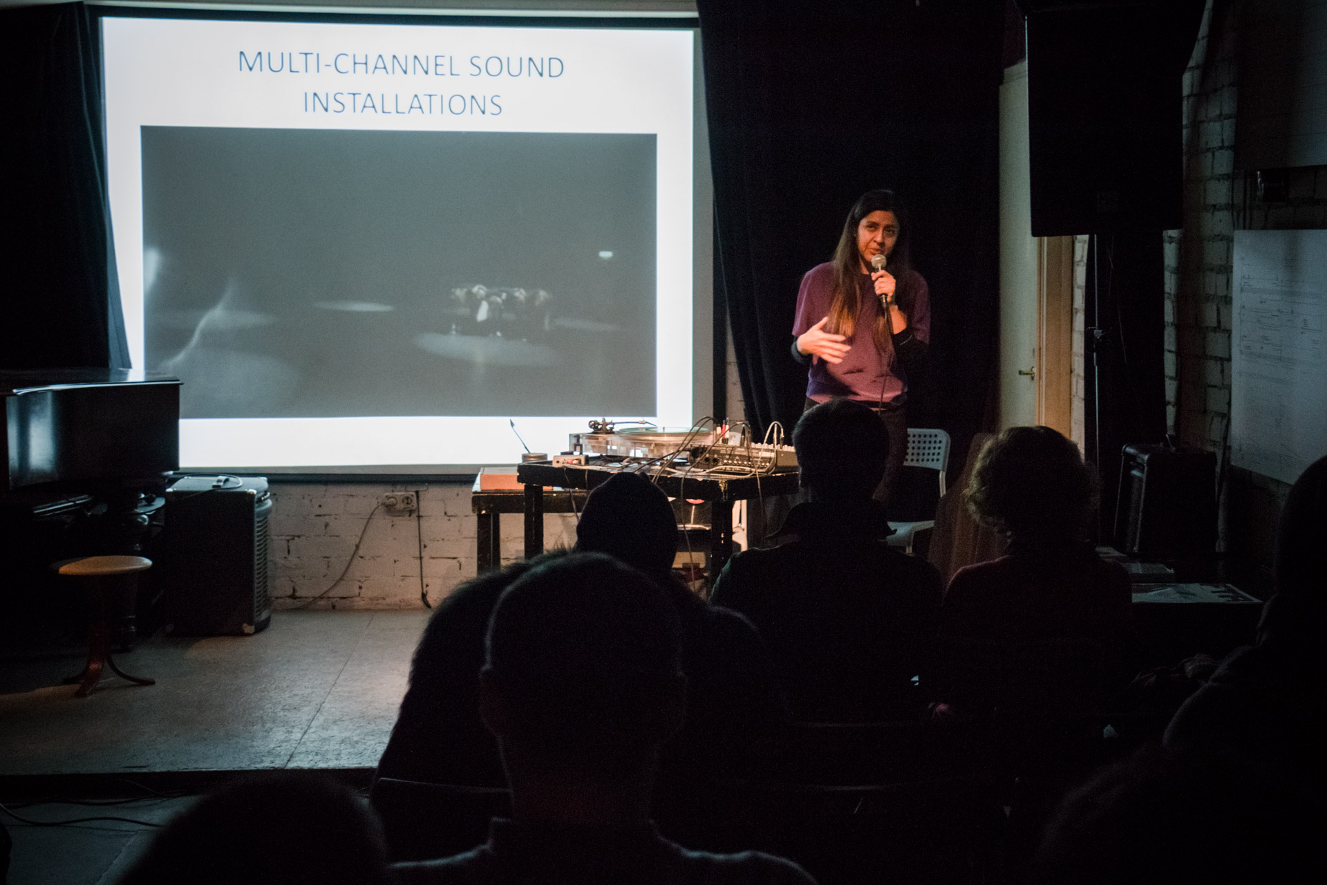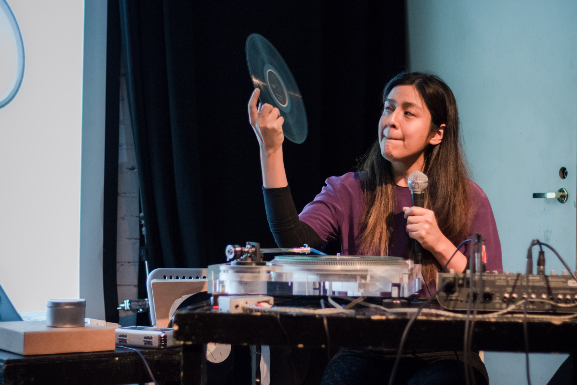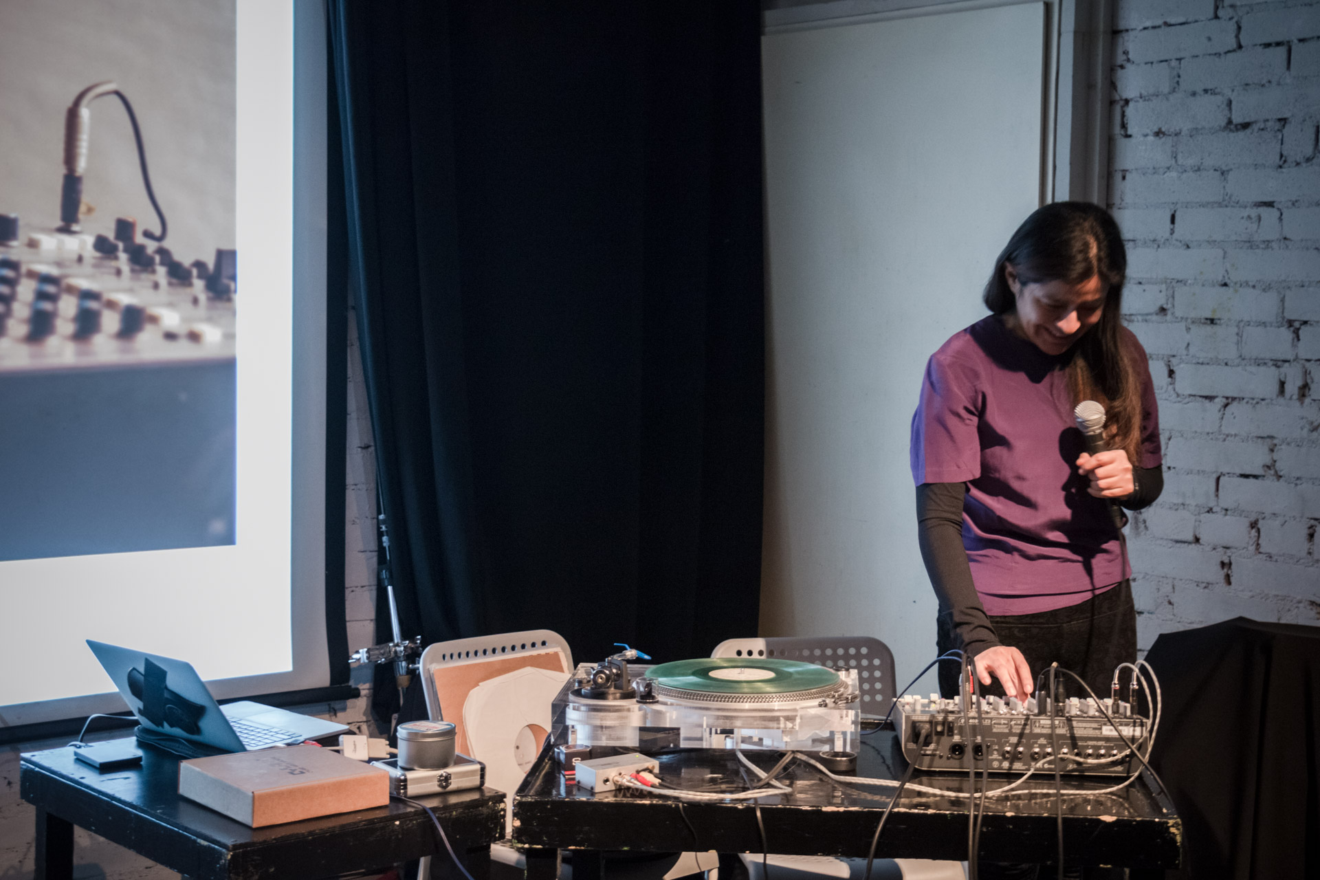 The lecture combined a lecture with a performance of recorded sounds from vinyl records with the electroacoustic sounds of vinyl and needle in various deteriorating phases. This approach merges the practice of improvisation with the inherent unstable conditions of a turntable, allowing accidents to dictate each sound piece. Audience members will be invited to try different techniques.